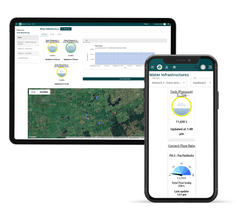 - Multiple networks/sub-networks: Map your water networks to reflect the farm layout.